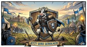 Dort stand ein Tier, das die Soldaten des Stammes noch nie gesehen hatten. Es war groß, gefleckt und sah deutlich friedfertiger aus als die Schlachtrosse der schweren Kavallerie. Hinnerk, hungrig und experimentierfreudig, versuchte das Tier zu melken – in der Hoffnung, es handle sich um eine Art flüssiges Eisen für die Schmiede.